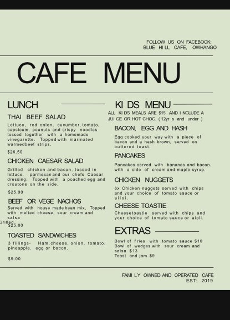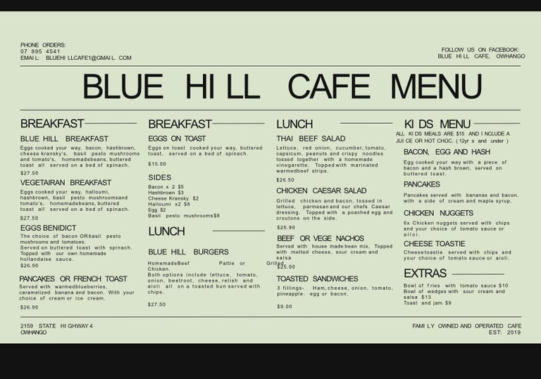 "Welcome to Blue Hill Cafe Owhango, the perfect place to stop for a break or special occasion. Situated just 15 minutes' drive south of Taumarunui Ruapehu, Blue Hill Cafe is easy to find in the rural village of Owhango on the Main Road. Blue Hill Cafe offers some of the best food and beverages in the region. Relax in modern, purpose-built surroundings and enjoy the service of a team that works hard to provide the best service possible. It's not easy to run a successful cafe, but the ladies at Blue Hill Cafe have nailed it. Whether you are passing by or are a local wanting to make a group booking for a celebration, we cater to everybody and we hope you feel the Aroha (love) when you walk through the door.