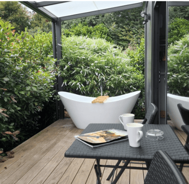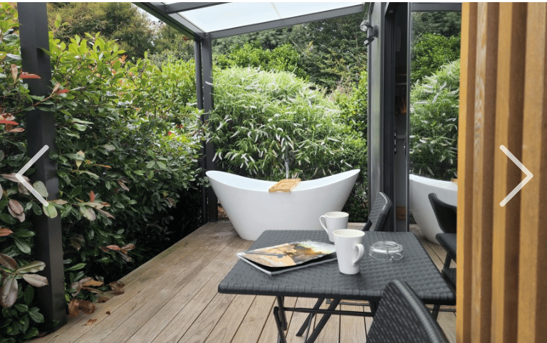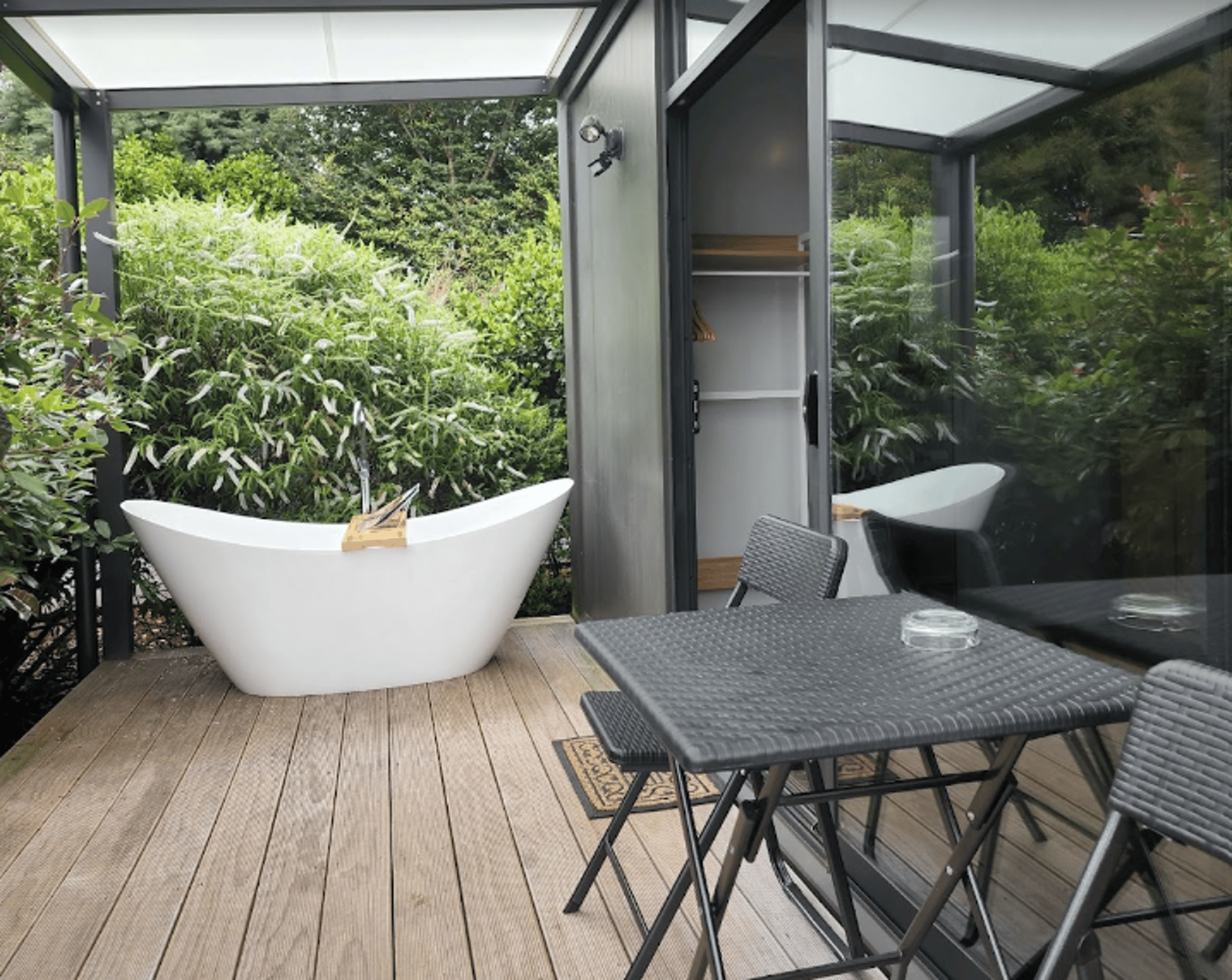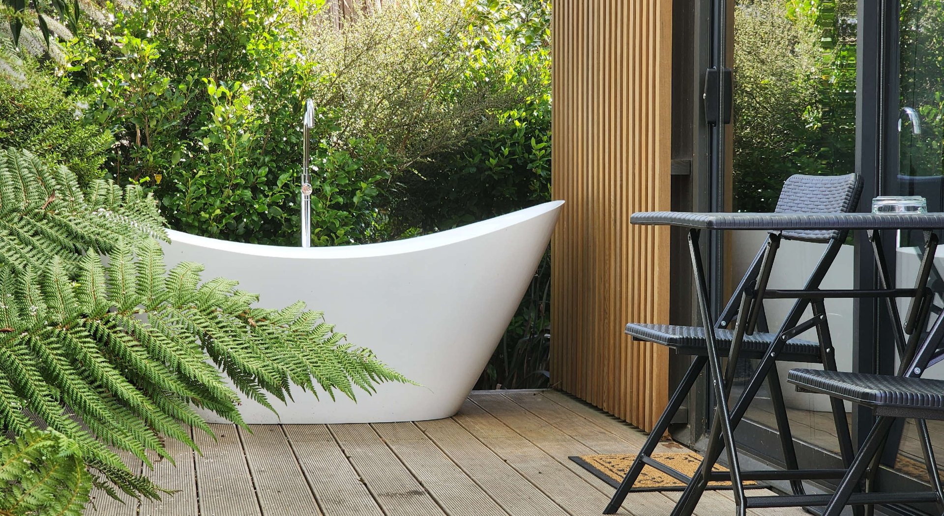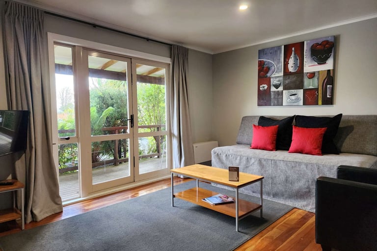 Perfect for 1-3 people. King bed, sofa bed, outside bath, tea & coffee, mini fridge, and your own deck with table & chairs. Use of the Lodge facilities while staying.