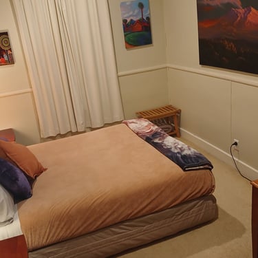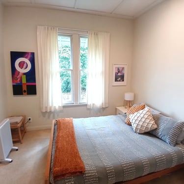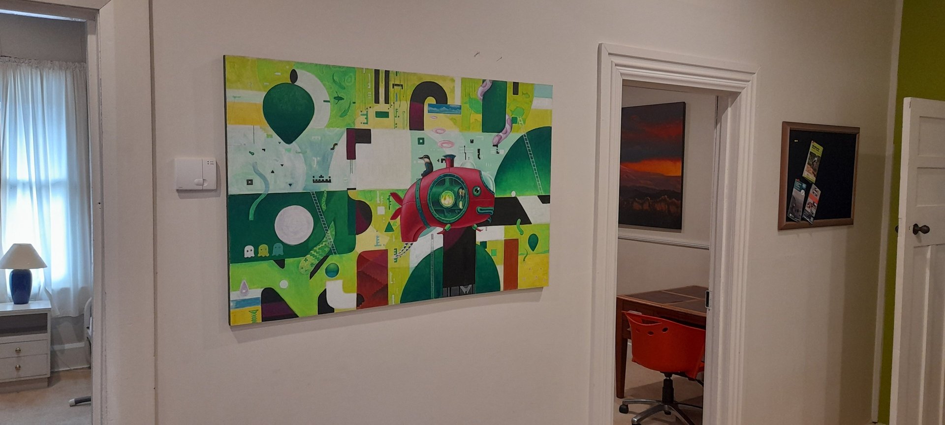 Outdoor spaces include two tables, one at the front and one at the rear of the house, along with a BBQ for alfresco dining. Each room is adorned with a collection of artworks, both originals and prints available for purchase. The property owner, also the Adventure Highway Art Trail administrator, is an artist who has won several Awards, a graphic designer, web designer, and illustrator with a portfolio full of commissions from leading Advertising Agencies and Design Studios.